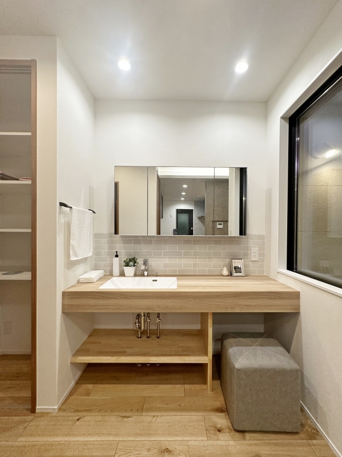 リビング横にはオープンな造作洗面化粧台もあります。