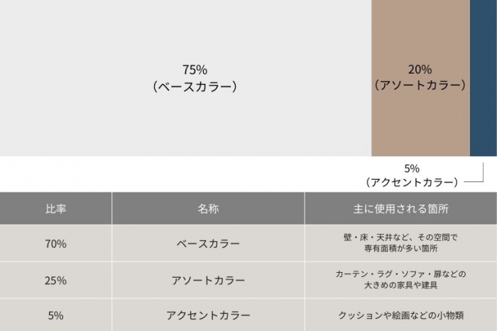 この対比はカラーコーディネートを行う上で基本とも言えますので、インテリアを購入する際にもぜひ意識していただきたい割合比です。