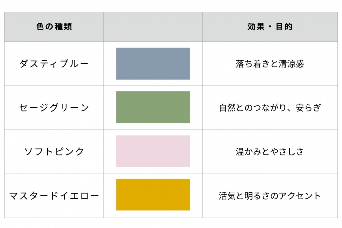 基本となるのは、白やライトグレーといったニュートラルカラーです。これに、木材の自然な色合いや、アクセントとして以下のような色を取り入れます。