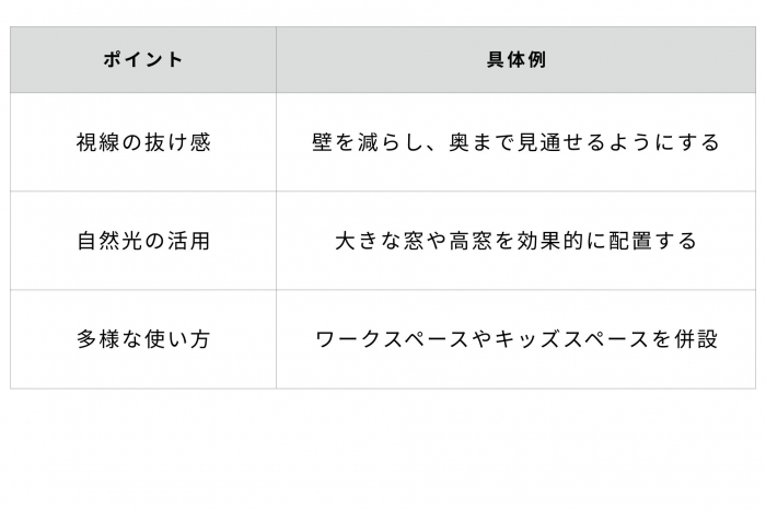 ●天井高の確保: 天井を高くしたり、勾配天井にしたりすることで、縦方向への広がりが生まれ、より開放感が得られます。