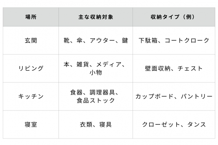特に、壁面を有効活用した造作収納は、空間に馴染みやすく、スッキリとした印象を保つのに役立ちます。また、衣類はウォークインクローゼットやファミリークローゼットに集約すると、各部屋が片付きやすくなります。