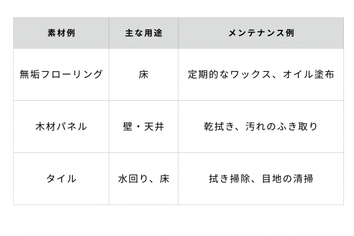・水回りはタイルや水に強い素材を選ぶなど、場所に応じた選択が必要です。