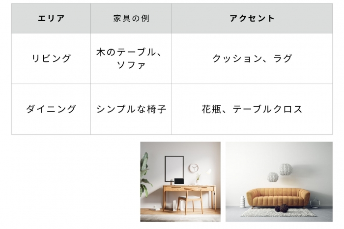 ●ゾーニング: 家具の配置やラグなどを用いて、それぞれの空間の役割をゆるやかに区別します。
