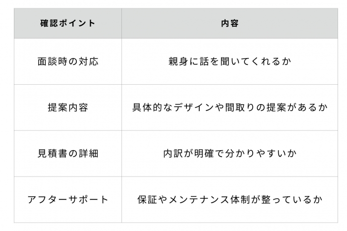 ノルディックスタイルや自然素材を使った住宅の建築実績が豊富かを確認します。過去の事例を見せてもらうのが良いでしょう。