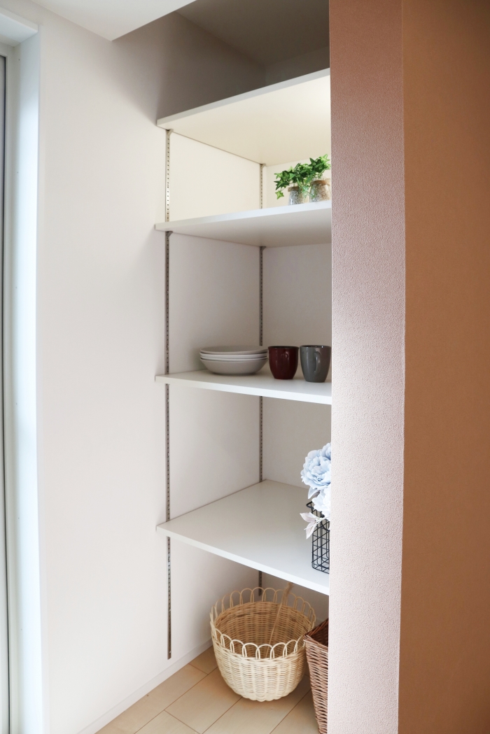 パントリー(キッチンからみて右側)可動式の収納スペースのためゴミ箱も配置可能です。