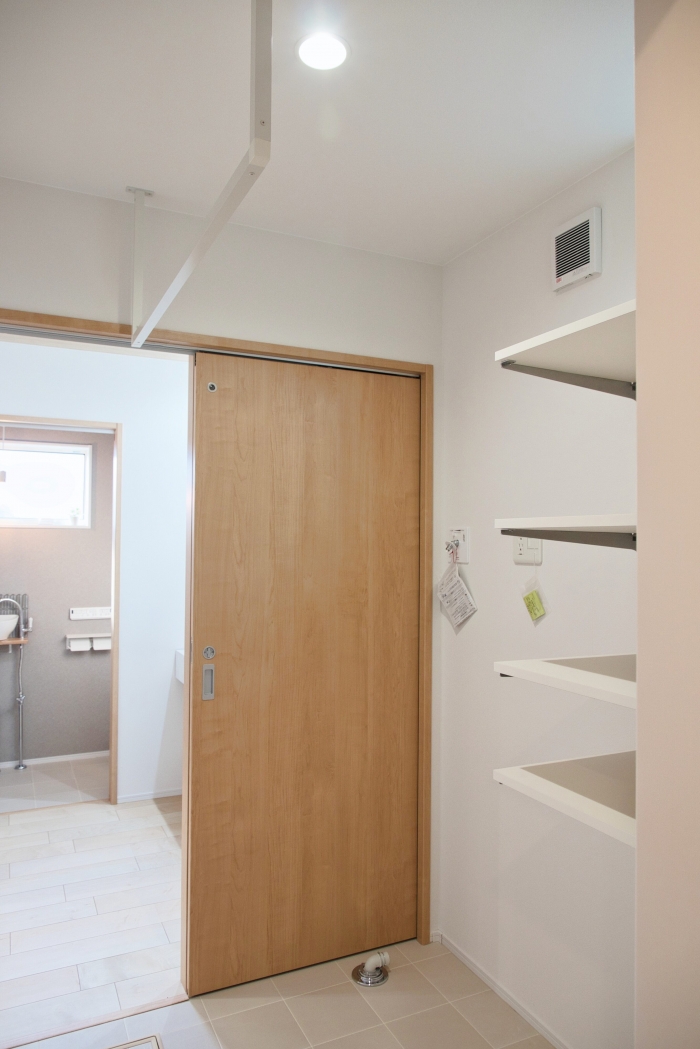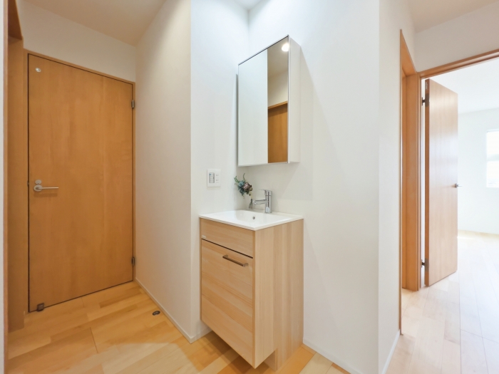 洗面室と脱衣室を扉で仕切ることで、家族が入浴中でも気兼ねなく洗面台を使えます。生活感を隠せるため、来客時も脱衣所の洗濯物などを気にせず案内でき、プライバシーと使い勝手を両立した快適な住まいを実現