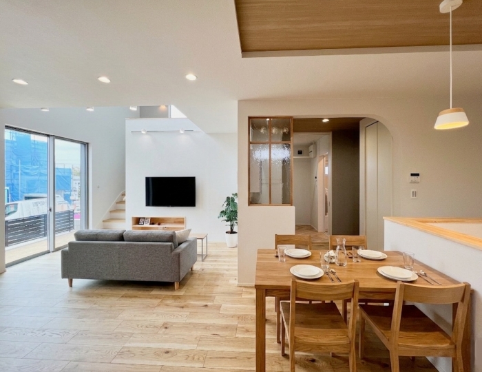 開放的な吹き抜けがある19.5帖のLDK、床暖房完備してます。