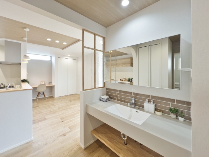 スタイリッシュな造作カウンター洗面台です。広さがあり脱衣室とは別のためお客様も使用できます。