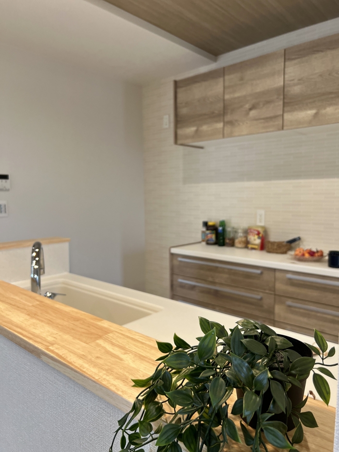 人大シンク、食洗機、タッチレス水栓、スリムレンジ、ガス水無両面焼きコンロが標準仕様です。