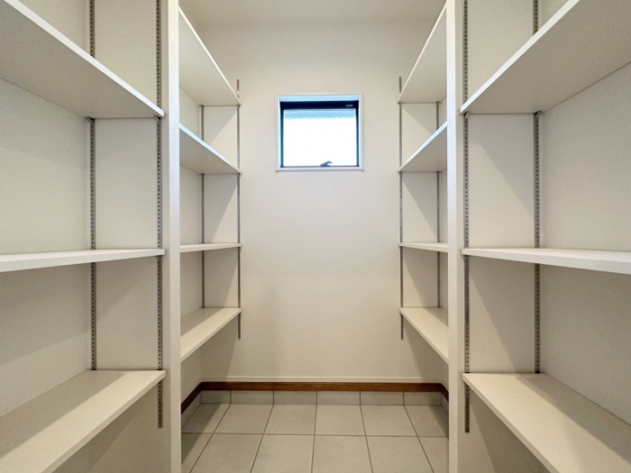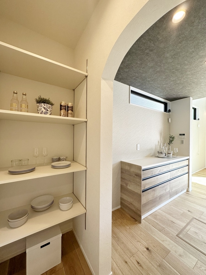 キッチンのR垂れ壁の向こう側には、パントリー収納を配置。