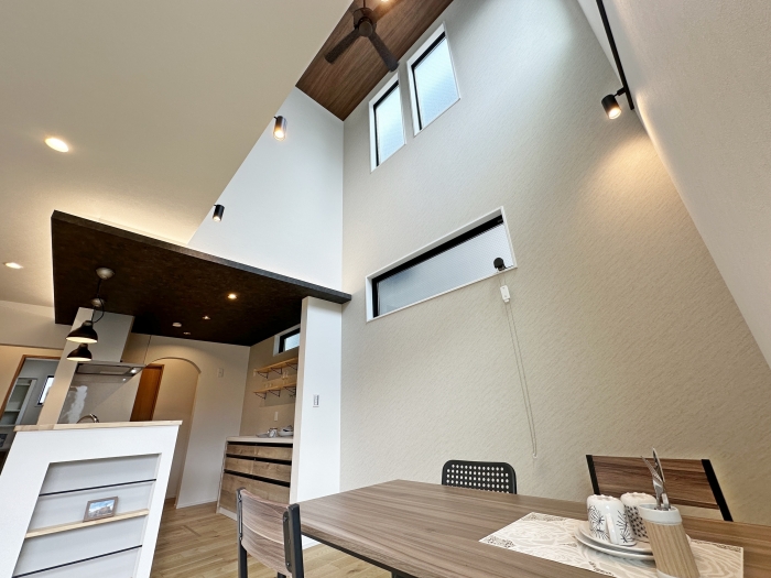 ダイニング上部は吹き抜け仕様で、明るさと開放感が心地よい空間。