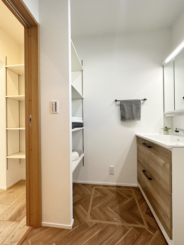 洗面脱衣室には、背面にオープン可動棚を設け、タオル・着替え・日用品などを機能的に収納可能。