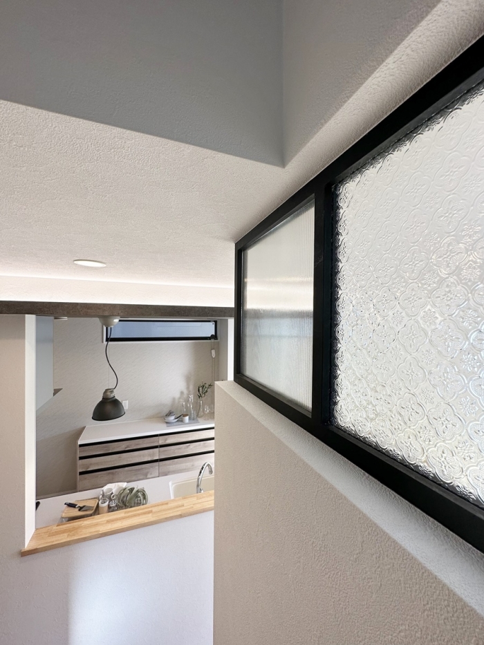 室内のアクセントとして、アイアン枠の造作室内窓を設置。