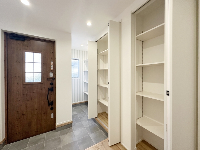 シューズクロークと玄関ドアは家族一人ひとりに選んで頂ける鍵システム(ファミロック)。
