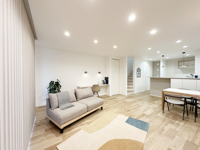 南向きリビングの掃き出し窓には天井埋込カーテンボックスを採用。カーテンレールが見えず、空間がすっきりと美しく整います。明るさと開放感をそのままに、洗練された印象に