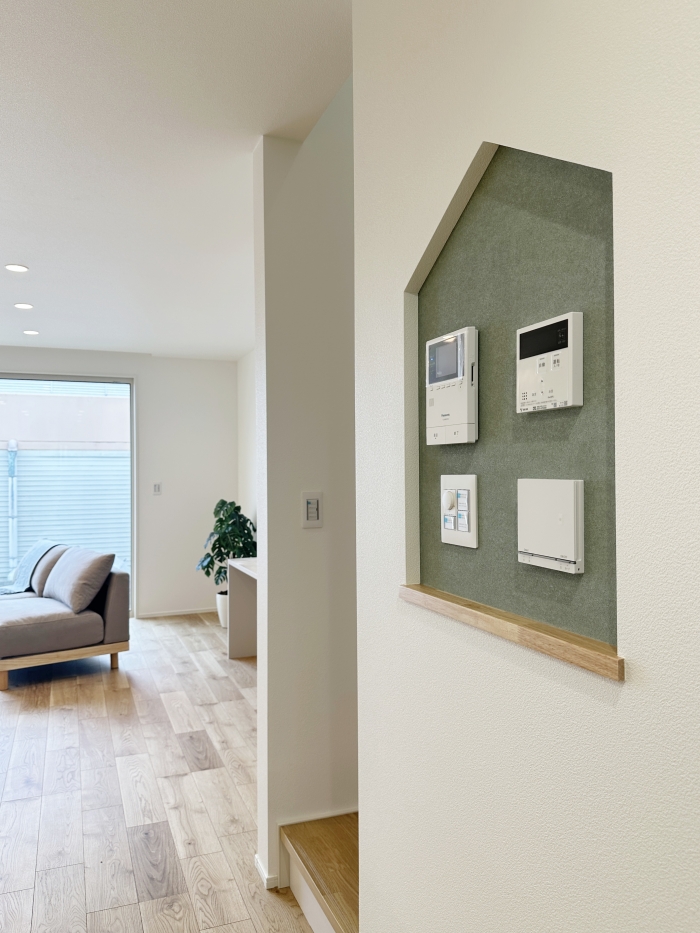 家型の可愛らしいリモコンニッチです。インターホン、給湯機リモコン、床暖房リモコン、照明スイッチが装備されています